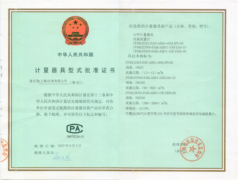 V锥型式批准证书